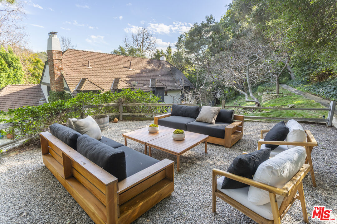 Charming country English gem, lovingly remodeled and tucked away at the end of a quiet cul-de-sac on a private road in lower Mandeville Canyon. This turnkey home is set behind gates and surrounded by lush greenery, offering a sense of privacy and security. Some features of this fully furnished home include a double-height entry, step-down living room with a vaulted wood beam ceiling & fireplace, formal dining room, and a paneled library/den with built-ins. The cook's kitchen offers a walk-in pantry, breakfast nook w/ bay window and a built-in banquette. The kitchen is situated next to the cozy family room with fireplace and french doors leading to patios, pool, spa, fruit trees, and lush gardens. Four en-suite bedrooms (three up and one down) include a luxurious primary suite with sitting area, fireplace, spa-like bath, dual sinks and a large walk-in closet. Rich hardwood floors throughout, detailed moldings and paneling, generous laundry room with sink, two washers and two dryers plus an oversized three-car finished garage with custom flooring and plenty of storage. Other notable amenities include water filtration and softener throughout, kitchen RO filter, security cameras, alarm, fruit trees and an outdoor shower & BBQ. This tranquil setting is just minutes from the Brentwood Country Mart, downtown Brentwood and many other daily conveniences. Available Feb 1st.